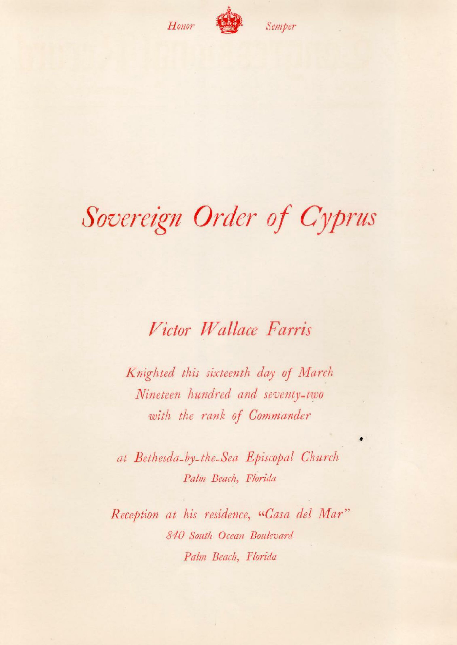 Victor Wallace Farris Ciprusi lovaggá történt avatására 1972. március 16-án került sor Floridában, Palm Beach-en, HMEH Lorenzo de Valitch Nagymester által.