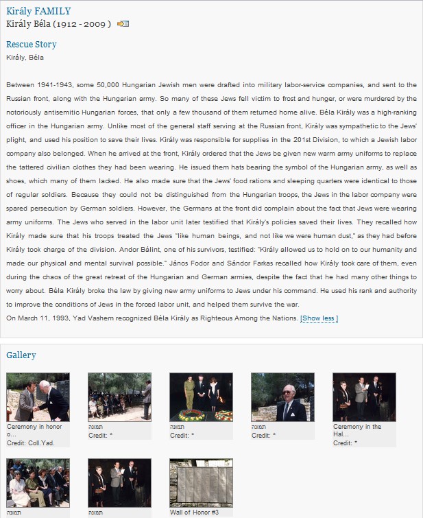 A Yad Vashem Intézet nyilvántartásából származó alábbi kivonatból megismerhető Sir Király Béla életének ez a rendkívül fontos fejezete, amivel mindörökre kivívta embertársainak megbecsülését.
